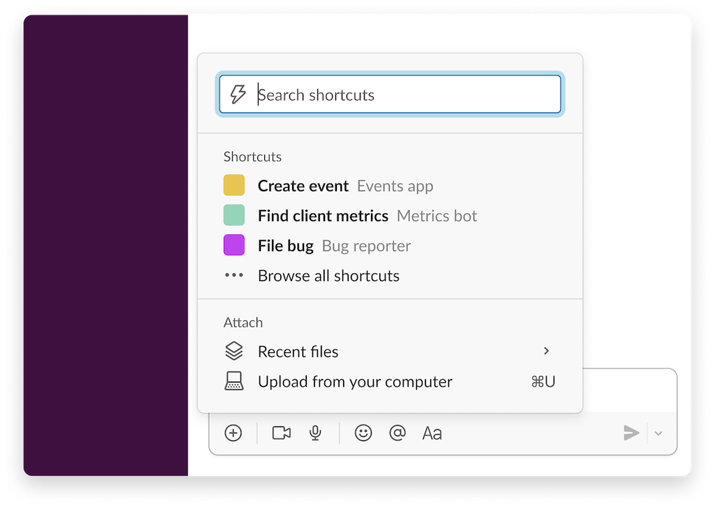 Shortcuts let users quickly trigger workflows from various prominent locations within Slack.
