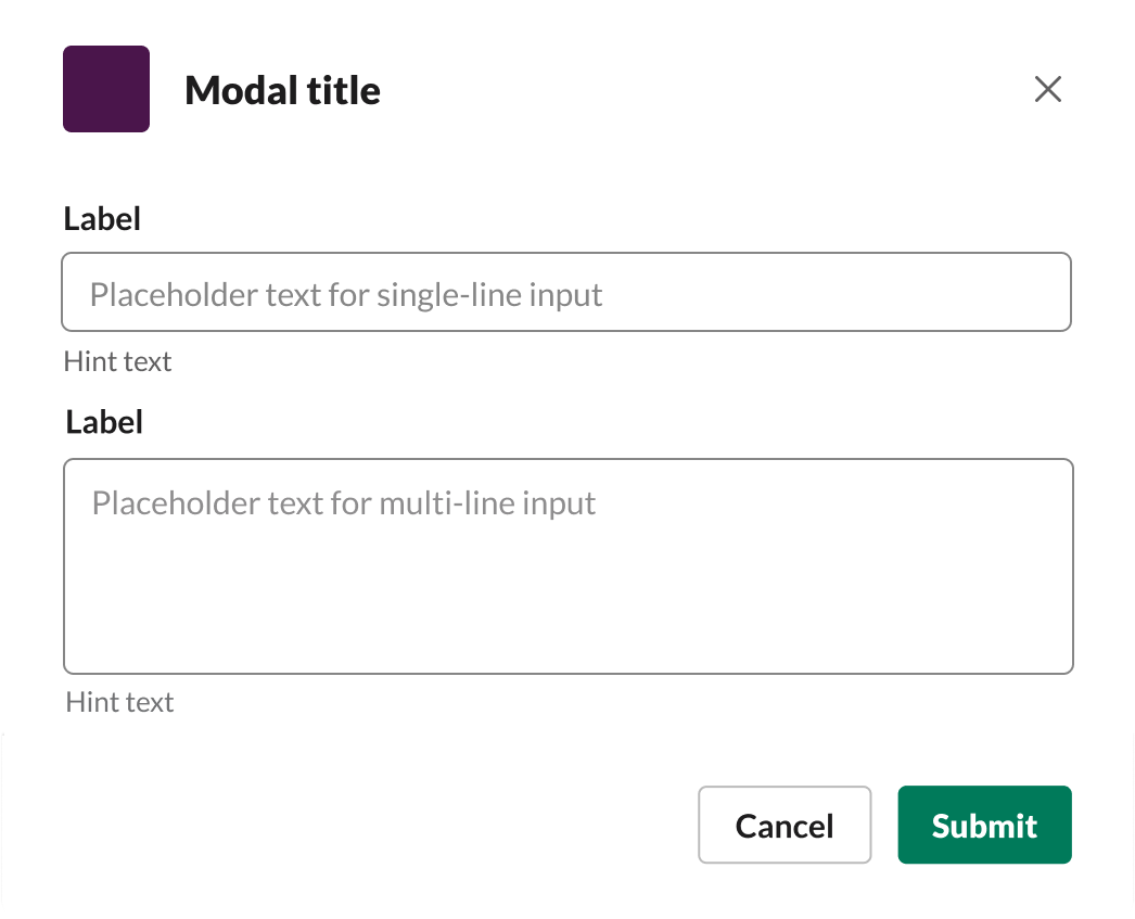 A modal is the Slack app equivalent of an alert box, pop-up, or dialog box. Modals capture and maintain focus within Slack until the user submits or dismisses the modal. This makes them a powerful piece of app functionality for engaging with users. Modals are available for both Bolt apps and Deno Slack SDK apps.